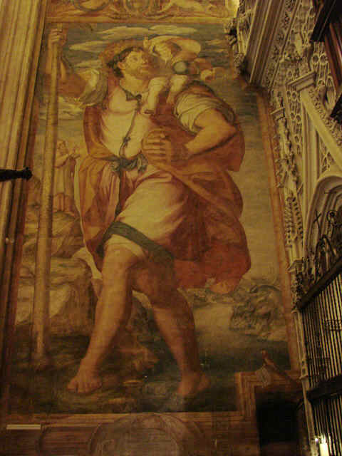 Sevilla 27 de Agosto 2007 Si me lo permiten les contare una pequeña historia píctorica y una simpatica curiosidad.- El paso dia 15 de Agosto en los prolegómenos de la procesión de la Virgen de los Reyes, la cCtedral, no solo estaba completamente iluminada , sino la llamada Puerta del Principe o de San Cristobal, que solo se abría para que entraran y salieran por ella, principes y reyes ( un servidor vio entrar por alli a The Queen , vease su Graciosa Majestad Isabel II de Inglaterra- con idependencia de que sea o no graciosa -en su visita a Sevilla ). Pues miren ustedes por donde, estaba abiertas de par en par y podia entrar y salir todo hijo de vecino , lo que favorecia notablemente la luz . Esos momentos hay que aprovecharlos.- Veran ,en la foto superior está el inconmensurable n fresco de San Cristobal obra de Mateo Pérez de Alesio o Alessio también Matteo de Lecce; nacio en Roma, 1547 , y no solo fue discipulo del mismismo Miguel Angel, sino que hay frescos suyos en la Capilla Sixtina , En 1589 viene a Sevilla y pinto el meritado fresco.- Próximo al mismo, en la Capilla de la Concepcion
