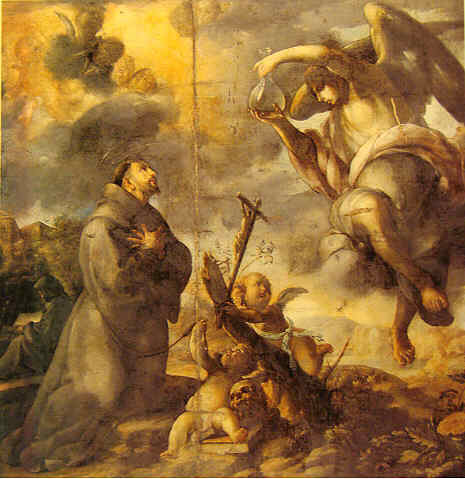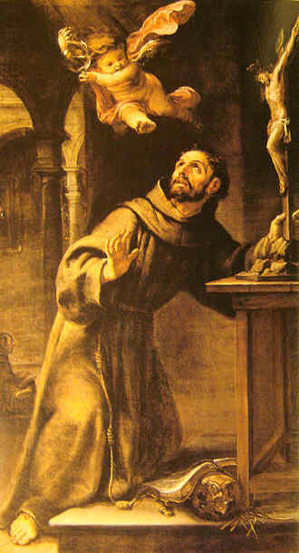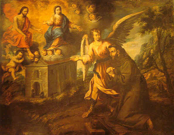 San Francisco no quiso ordenarse: sacerdote . Un día que Francisco oraba en el convento de Vicalvi (cerca del Monte Casino), se le apareció un ángel llevando en la mano una ampolla que contenía agua transparente: que le dijo "Mira, Francisco , así ha de ser quien desea dar a los hombres el cuerpo y la sangre de Cristo!" El Santo, en su humildad, pensó que no podría jamás alcanzar tan alta perfección y renunció al sacerdocio. Que digo yo que este angel se le deberia aparecer a mas de uno con la botellita .- Este pasaje queda plasmado en estas dos obras, tambien en el Museo , la superior de Juan de Valdés Leal de 1665 y la de abajo de Domingo Martinez de 1715 .-