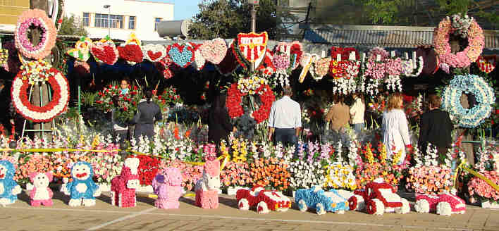 Los puestos de flores, con sus coronas, ramos y escudos deportivo a lo clasificación deportiva floral, incluso se vio un escudo del Madrid como si estuviéramos en el cementerio de la Almudena de Madrid., así como los juguetes de flores que mas de un padre y una madre se le hiela el alma al verlos.- Sevillanos y sevillanas difuntos descansad