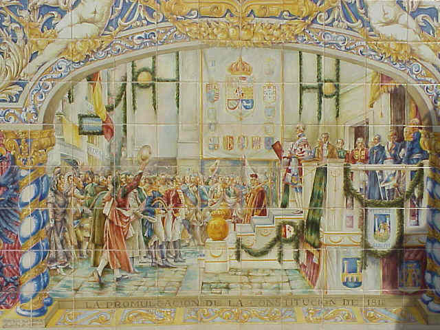 Proclamación de la primera Constitución Española de 1812 en Cádiz , curiosamente rodeados por tropas francesas . Curiosamente un ejercito que defendía los mismos ideales que los proclamados en esta Constitución ( no solo los defendía sino que su país los invento ) y que se liberaba de la monarquía absolutista . El invento duro muy poco ( la carita que se les quedaria a los padres de esta Carta Magna seria un poema ) con el regreso de Fernando VII , al grito paradójicamente popular de "!Vivan las cadenas! "