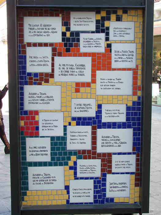 En cuanto al "monumento" propiamente dicho, en este caso no es la novia de Chuqui, como el que han puesto en la ex-plaza de la Pescadería y que hoy no se sabe muy bien lo que es, es un querubín escapado de algún paso de Misterio y no se sabe muy bien que es lo que representa , pues mas que un alfarero parece que anuncia una taquilla oficial de reventa de los toros , con una entrada en la mano .Estas cosas la hacen infinitamente mejor en Valencia y les pegan fuego. Aquí desgraciadamente nos la dejan para siempre .- Esta birria , nos la colocan en la calle San Jorge ( en trianero se pronuncia San Gorge, como el Cesá y el Gorge Cadaval ) cerca de una fachada que por si sola es un monumento a la cerámica trianera , en una ciudad donde esta el mayor museo cerámico al aire libre del mundo y que se llama Plaza de España i miren como la tiene de abandonada. ! Ole !.-