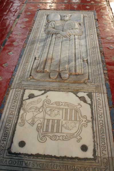 El suelo de la iglesia ( por cierto de una limpieza impoluta ) esta lleno de tumbas algunas de una gran belleza como esta donde reposan benefactores y protectores del convento , personajes destacados de la aristocracia sevillana de la época .-