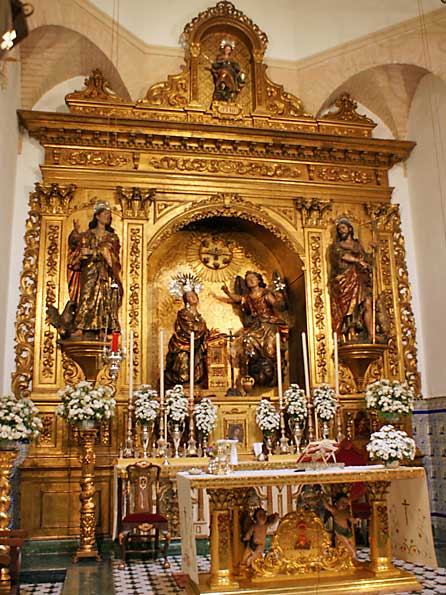 El retablo mayor tenemos el grupo escultórico de la Anunciación y a ambos lados San Juan Bautista y San Juan Evangelista y en el ático Santa Marta . Las esculturas son de Francisco Dionisio de Ribas