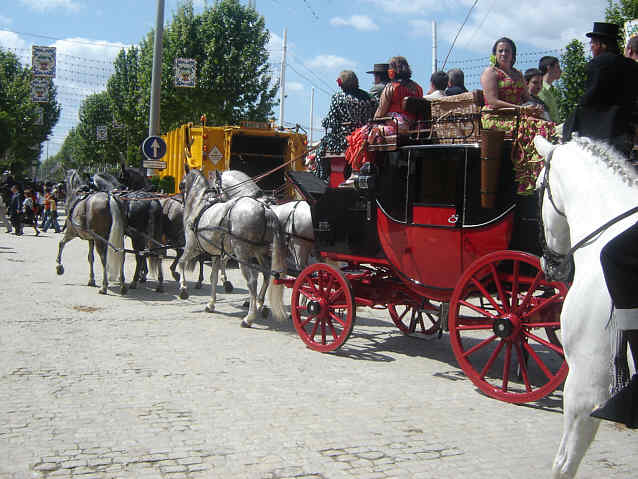 Tiraba de un coche tipo DRAG, que últimamente parece que viene en el Bimbo por la proliferación de los mismos un carruaje , absolutamente inútil e inadecuado para la Feria , pues sus ocupantes, para poder ver y ser vistos tiene que ocupa la parte superior del mismo , como en su día ocupaba la viajeros del siglo XIX y primeros año del siglo XX , pero en Inglaterra .C hocaba un poco las señoras y señoritas vestidas de flamenca y su mayoral con un sombrero de ala ancha , en este tipo de coche y con esta caracteristicas de guarniciones
