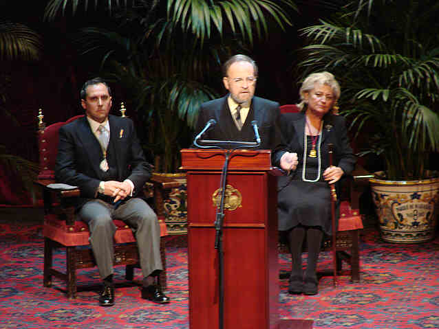 9 DE MARZO DE 2008 El sueño se ha cumplido, tras muchos años de espera hoy los "hermanos" de la "Cofradía de la Columna" del maestro Burgos, lo hemos visto culminado .- Lo bueno, es que no es el primer pregón, ni el último. Antes de venir a este atril ya ha escrito varios pregones y después de este día y por muchos años vendrán muchos mas puntualmente como en cada Cuaresma. La diferencia es que hoy no lo hemos leído sino que el autor nos lo ha leído .- Como en cajón de sastre ( de casta le viene al galgo ) ha habido de todo y bueno , mucho bueno . Ha habido sal y pimienta, emoción y reivindicación ( quizás el aplauso mas atronador y largo el alegato contra el aborto, hubo dos personas del escenario que no aplaudieron este pasaje ), la gracia, la guasa, el pellizco, el recuerdo de verdad del bueno , todo ello en una faena de mas de hora y media, donde no falto hasta un espontáneo desentonado. Oles de plata de ley y estruendodosos aplausos. Oiga y si no se lo cree aquí tiene de botones varias muestras : |