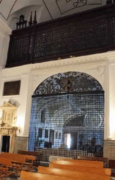 Reanudamos nuestra visita en el muro del coro , donde si echamos una mirada a través de la celosía vemos la profusa decoración de pinturas murales y esculturas que hay en su interior ,
