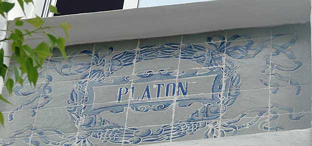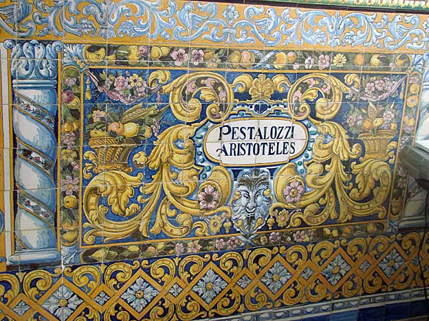 Aqui pueden ver paños de la azulejeria original del vestibulo y en las fotos siguientes, la ornamnetacion de estos impresionantes lienzos ceramicos, donde se repite el repertorio de filosofos y pedagogos en el despacho de dirección , que parece un anticipo de la Plaza de España.-Estuvo a punto de ser demolido en 1967 y felizmente restaurado entre 1978 y 1980 por los arquitectos Antonio Barrio Ferrer y Francisco Torres Martinez![]()