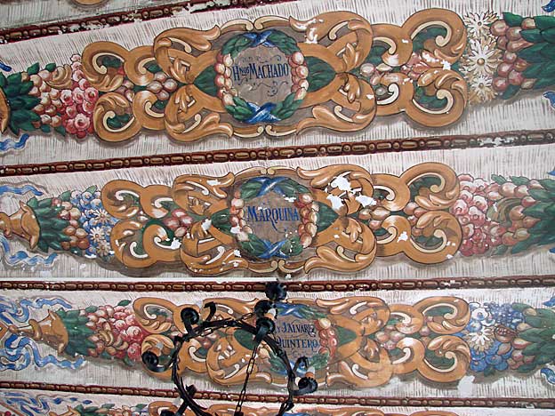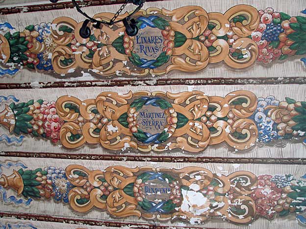 Una vez mas la genialidad de Anibal Gonzalez pues tal como diseño colegio ( estamos al principio del siglo XX ) marcó un antes y un después en la concepción de centros de enseñanzas que fue copiado en edificaciones posteriores . Las aulas de los parvulos en la planta baja para que no tuvieran el peligro de las escaleras ( eso hoy en el siglo XXI no se le mete en la cabeza a nuestra Consejeria de Educación ) grandes ventanales para luz natural y ventilación para cuando no esten los alumnos. Oficinas del centro junto al vestibulo. Cocinas, comedor, biblioteca, patio exterior y cubierto Un vestibulo amplio para que los padres puedan esperar a sus hijos a recogerlos . Saneamiento a la altura de los alumnos y en buen numero . Fue tan preclaro su diseño de espacios y servicios que se adelanto ocho años al Reglamento Nacional de Escuelas Graduadas aprobado en 1918Un salon de actos de 15 metros por 5 , del que pueden ver a continuación , como es el impresionante techo del mismo con frescos con los nombres de dramaturgos españoles![]()
