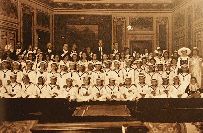 Precisamente en el escenario de este salon de actos vemos el pequeño Batallón de Marineria Infantil del Colegio Reina Victoria ( como ven no hay nada nuevo bajo el Sol con estos de vestir las bandas de cornetas y tambores trianeras con todos los uniformes de la marina ) . -Se creó en 1912 con la finalidad de infundir el espiritú patrio a los niños ( ¿ alguine sabe hoy en este penoso pais lo que significa el concepto PATRIA ? ) ensayandola agrupación en el amplio patio del colegio y desfilando por las calles del barrio![]()