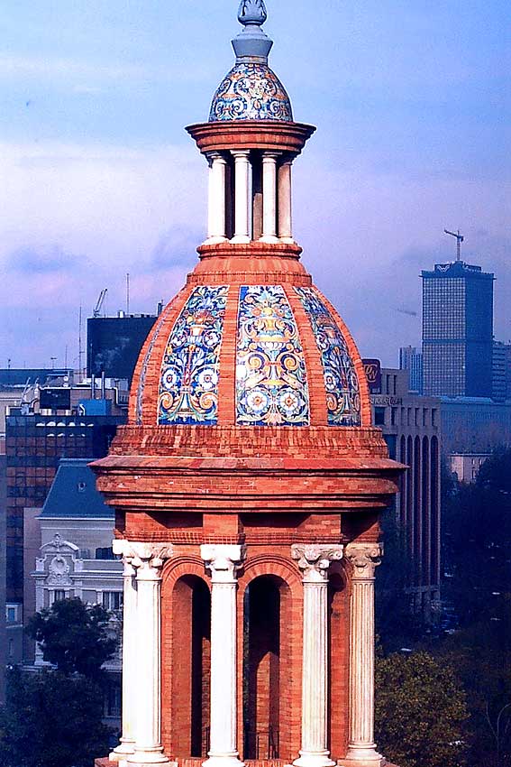 Aqui tienen el edificio completo , cutyo diseño recuerda bastante a la Plaza de España de Sevilla . Ladrillos limpios, azulejos , arcadas, hierro de forja y en la base se puede leer ABC y Blanco y Negro . Pero de nuevo el telón de fondo no tiene nada que ver con Sevilla . Una pista su arquitecto indiscutiblemente es Anibal Gonzalez Alvarez Ossorio . ¿ Se rinden ? .- La vida de Aníbal González estuvo ligada a Luca de Tena, En 1901 fue Torcuato Luca de Tena el que le consigue su primer trabajo, en la exposición de pequeñas industrias que se celebra en el Retiro madrileño. A lo largo de su vida, Aníbal González realiza diversos trabajos para Luca de Tena, entre ellas podemos destacar su casa de la Palmera, una obra maestra del arquitecto tanto en su exterior como en su interior, aunque éste fue saqueado en 1932, habiendo llegado sólo nuestros días una de las salas originales ricamente decoradas con azulejos.- El diseño se inspiraba en la Plaza de España y así lo recordaba en 1928 un cartel donde rezaba: "Esta fachada ha sido proyectada y dirigida por el arquitecto don Aníbal González y Álvarez-Ossorio, insigne autor de la plaza de España y otros maravillosos de la exposición Íbero Americana". Y es que la fachada es todo un alarde de sevillanismo. . No se trató de un edificio nuevo, sino de una ampliación, el edificio posee otra fachada la calle Serrano, en clave neoplateresca y que data de 1899. El edificio, llamado también "Blanco y Negro", se sitúa en la Castellana y se construye entre 1926 y 1928. Actualmente, es un centro comercial. La próxima que vaya a Madrid , hagale una visita ( Como siga asi me veo haciendo "El Madrid que no vemos" ) .- Prohibida la