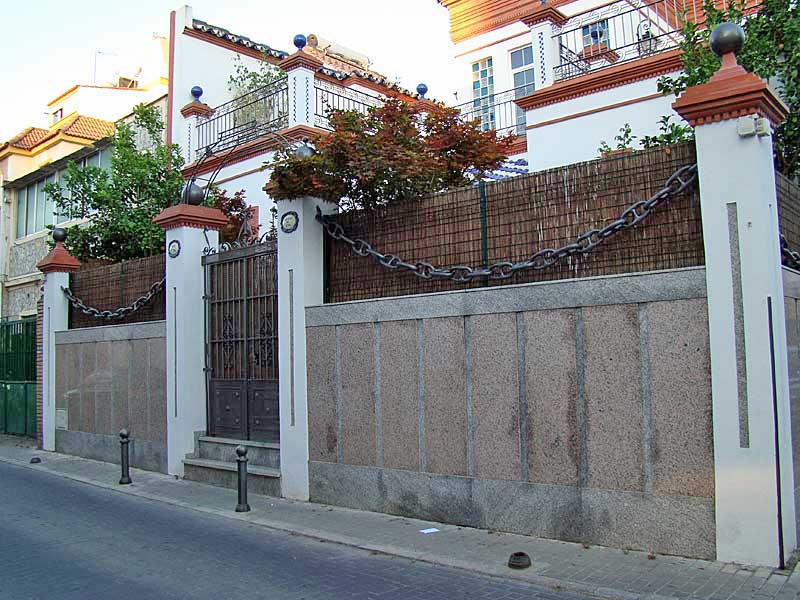 Estamos en el barrio de Nervión , concretamente en la calle Santa Elena y vemos como el propietario de este chalet , ha decorado su cerca de una forma realmente peculiar y sin duda única . Veran, en Sevilla solo hay dos edificios rodeados por cadenas uno es nuestra Parque Temática Catedral Hispalense ,( de la que en su día hice un sesudo e inutil estudio Las columnas encadenadas de la Catedral ) y el Archivo General de Indias .-