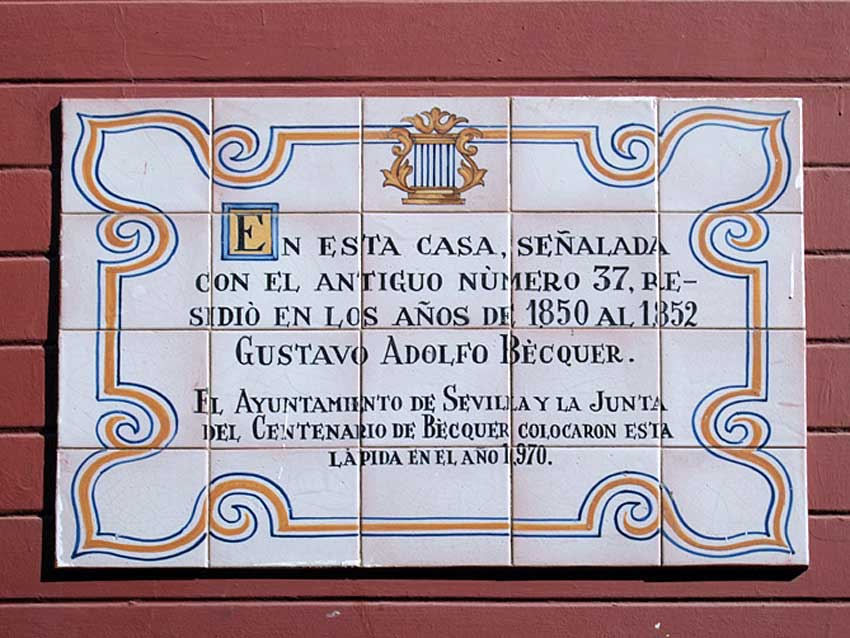En la foto superior vemos el siguiente texto : "En esta casa, señalada con el antiguo número 37, residió en los años de 1850 al 1852 Gustavo Adolfo Bécquer. El Ayuntamiento de Sevilla y la Junta del Centenario de Bécquer colocaron esta lápida en el año 1970". La placa cerámica en cuestión se encuentra en la calle Potro num 6.-