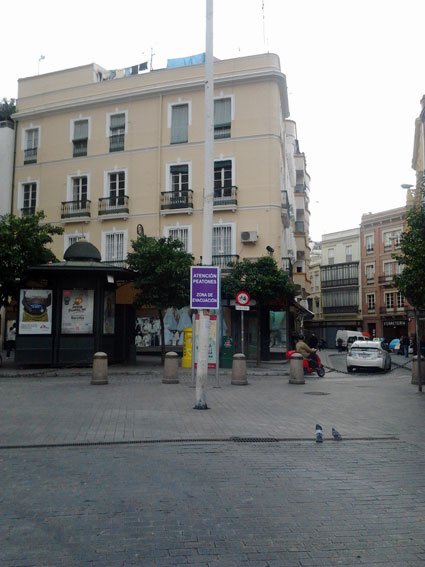19 de Febrero de 2013 En esta falsa "Cuaresma" del desastre de Cavite ( ahora explicale tu a un niño de la LOGSE lo del desastre de Cavite ) como el que se ha vivido con el Vía Crucis de la Fe, ha habido algunos detalles que me gustaria comentar con ustedes, mas mundanos que espirituales .- Alguien se pensó, que esto maremagnum de catorce pasos dando vuelta por Sevilla, iba ser algo parecido al Madrid Arenas ( de trágico recuerdo ) , como si Sevilla fuera una ciudad no acostumbrada a los grandes movimientos de masas, teniendo por medio a todas las cofridas que le echen. En este preocupación hubo alguna mente pensante que le dió por clavar en medio de la Plaza de la Botellona , ( antes del Salvador ), un solitario poste a modo de cucaña vertical ( que las hay ) con el letrero que pueden ver en la foto de la derecha : ATENCIÓN