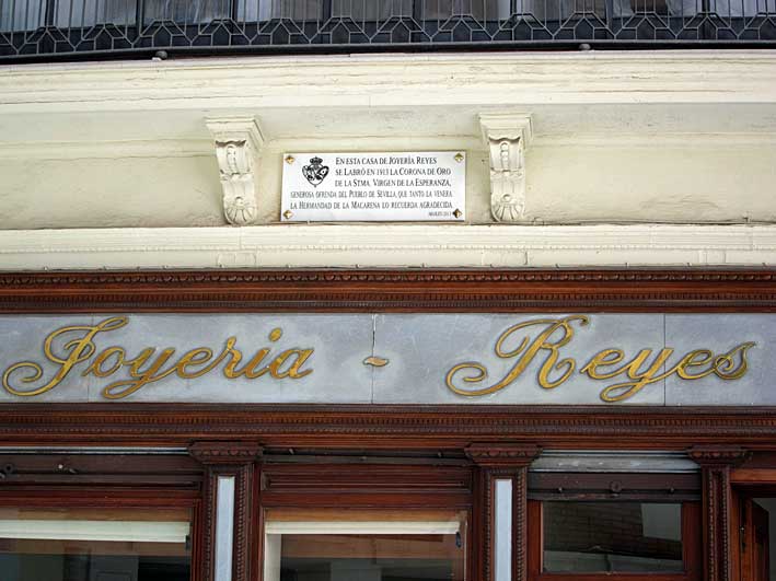 La corona se habia realizado en oro de ley a buril esgrafiado por la prestiogiosa joyeria de D. José de los Reyes , sobre diseño del genial Juan Manuel Rodríguez Ojeda , cuando ocupaba en la Junta de Gobierno de la Hdad de la Macarena el cargo de Consiliario 2º. Con motivo de tal efemérides se coloco "antié", esta lápida en las puertas de la sevillana Joyeria Reyes .-