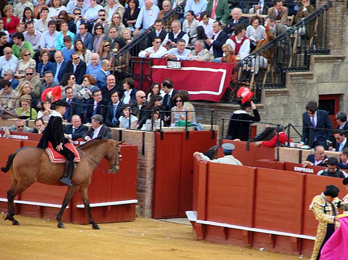 Cuando ha terminado el paseillo, los alguacilillos después de que se abra la puerta de la barrera, entran en el callejón de la Puerta del Prícinpe, se colocan bajo del palco real , al lado del palco del presidente . Uno de ellos se quita el sombrero y con él coge en el aire la llave de los toriles que le tira el presidente , lo que requiere una doble destreza, del que lo lanza y del que lo recibe . Una vez recogida ,al galope se encamina al empleado encargado de abrir la puerta de los chiqueros entregandole la llave .-