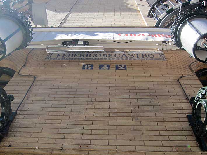 Bajo un lamentable toldo publicitario ( incomprensiblemente autorizado en un edificio histórico de esta categoria, impensable en otras ciudades europeas ) y sorteando la habitual bateria de veladores ( que nos van a sacar de la crisis ) , en la acera de los pares se puede leer el rotulo : FEDERICO DE CASTRO y los numeros 2, 4 y 6 .