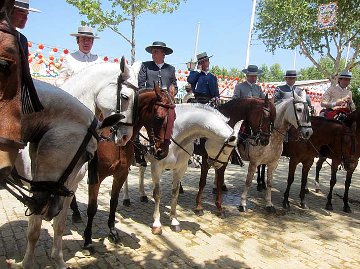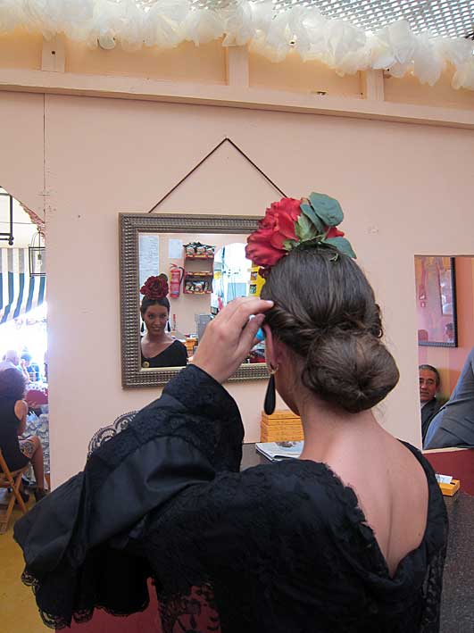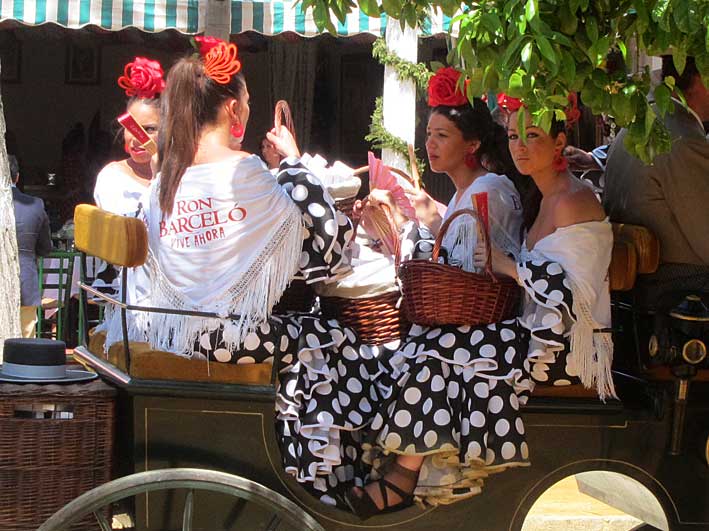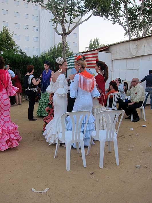 Inventos feriantes de sillas y mesas plegables......sevillanas . Innovación y tradición .- Como dice la letra de la sevillana " Nosotros con los caballos con sombrero y chaquetilla // Nosotras vamos andando y cantandole ......." En la Feria no se bebe , se le da conversación a la copa como estas dos guapas flamencas Flamencas - propaganda repartiendo abanicos .....se los quitaban de las manos, pero de verdad por " las calores" que hacia Perfección Cuidando los detalles Claudia Alfaro de Entre cirios y volantes Si ayer veíamos casetas con patio ,
