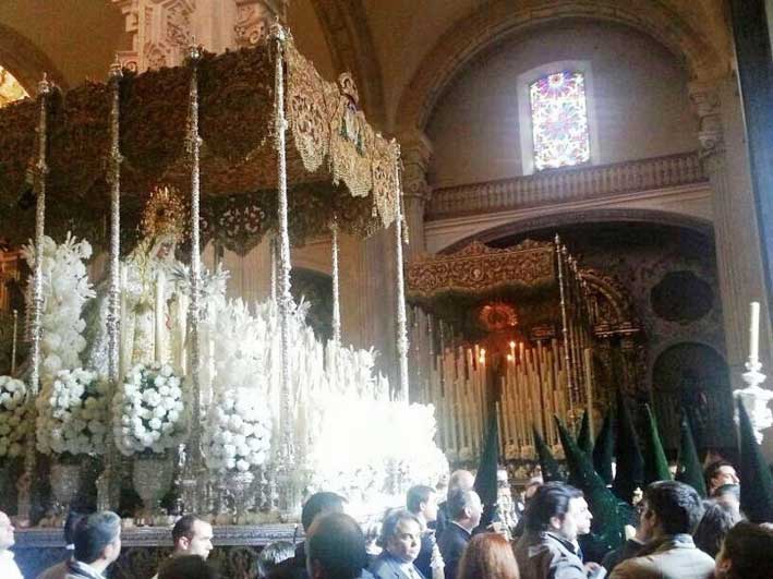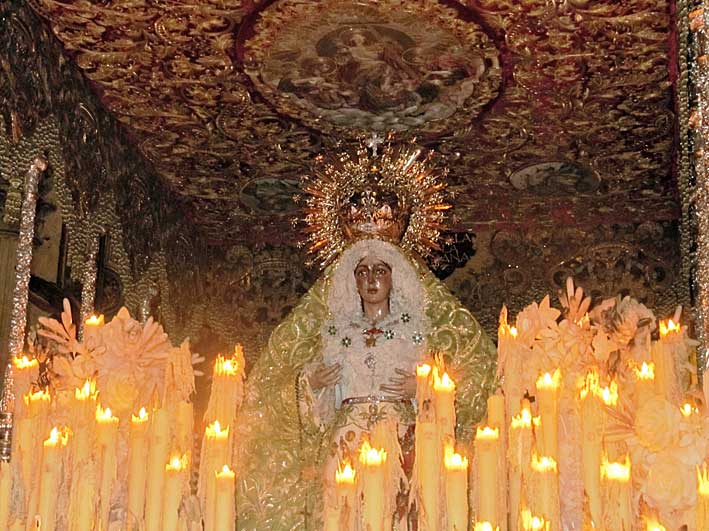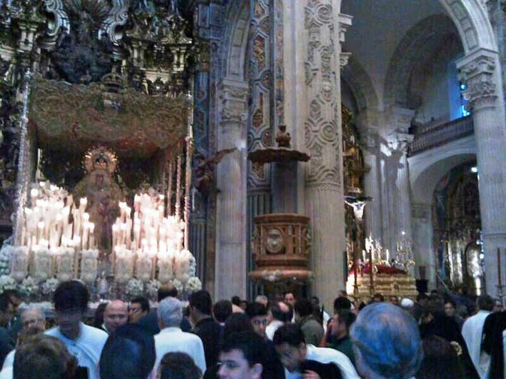 La Macarena en el altr rmayor del Salvador y al fondo el paso del Cristo del Amor