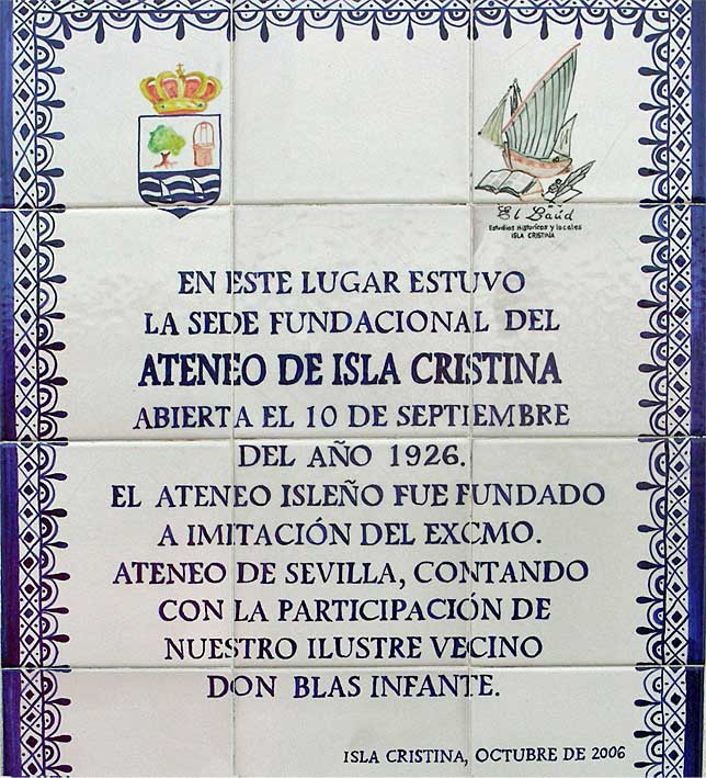 Efectivamente en la avenida Ángel Pérez, en su sección conocida como Paseo del Chocolate, se localizaba el Ateneo de Isla Cristina, fundado el 10 de septiembre de 1926 a imitación del sevillano, contando con Blas Infante entre sus participantes, cuando estuvo allí viviendo .- |