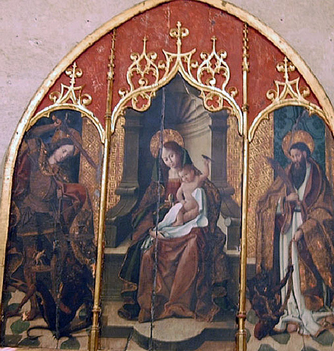 Son tres tablas ( logicamente es un tríptico ) donde se combinan motivos góticos y renacentista, en el centro la Virgen María con el Niño Dios . En la tabla de su izquierda San Miguel Arcangel y en la de su derecha representa a San Bartolomé haciendo alusión a un episodio de su vida, cunado resucita al hijo del rey de Armenia y libera a su hija del diablo .-