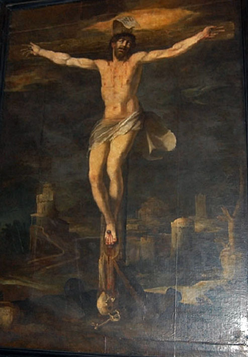 La otra obra es un colosal crucificado fechado hacia 1611 y que está atribuido a Juan Gui Romano, un artista que pasó por Sevilla a principios del siglo XVII y que dejó en la ciudad obras de extraordinaria calidad, como este Crucificado o el conjunto de piezas del retablo de la Piedad que se conserva en la iglesia de San Martín.