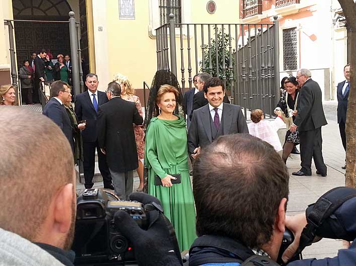 La Costanilla mediodia, salvo por una gran presencia policial ( cosa rara la policia local sin poner multas a dos amnos ) y mas raro aún, lo limpio y escamondadas que estaban las aceras y calzada , todo parecía un sábado normal , con una boda normal con las inevitables señoras y señoritas disfrazadas, mas que vestidas, para este tipo de eventos como suele ser habitual .- Pero no, en la Parroquía de San Isidoro se iba a celebrar la boda del hijo del alcalde de Sevilla, que en esta ocasión ejercia de D. Juan Ignacio Zoido, de padre y muy señor mio, mas que de @zoidoalcalde . Así que abandoné mi botellín que tomaba placidamente en el bar de esquina, y tuve que ejercer sin oficio y sin vocación de paparazzi modelo Hola y de propina sin una cámara adecuada .- Oiga esto es mas complicado que una salida procesional de Gloria, en las procesiones la lucha es por las alturas con los tontos de los palitos, mientras que aquí se forman auténticos tumultos, incluso dandose el caso de un pequeño incidente entre un miembro de la seguridad y un reportero gráfico, que este último a voz en grito no tuvo por menos que quejarse de una forma absotutamante inadecuda que no paso a mayores .-