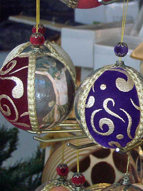 En otra bola vemos incluso a un Crucificado el Cristo del Desamparo y Abandono de la Hdad del Cerro . Tanto a la persona que ha diseñado y fabricado esto, como el que la vende, como las potenciales personas que lo compren, ( habra que las verán hasta ideal de la muerte ) deberian urgentemente repasar el Tiempo de Navidad y el Tiempo de Cuaresma y Semana Santa , pues es mas que complicado encajar Dolorosas y Cristos, con el Nacimiento del Niño Dios .- Hemos pasado de las camisetas, a los trajes de flamenca en el Simof , luego los bolsos,y ahora a las bolas de Navidad kofradieras que aqui ven . Como esta claro que el merchandising cofrade no tiene limites ¿ que será lo próximo farolillos de Feria penitenciales; sombrillas, flotadores o colchonetas cofradieras ?. Esto esta a la venta en Sevilla Capital, no es una multinacional por internet extranjera a la que luego nos tiramos al cuello o ponemos el grito en el Cielo .- Aunque por otro lado, uno no sabe a que carta quedar. Ayer le retiraban por fín la mamarrachada hortera de la mal puesta funda de croché de la estatua del Cid, mientras nuestro @zoidoalcalde agradecia publicamente a esta supuesta artista, por dedicarse a ir por el mundo tapando auténticas obras de arte, por haber pasado por Sevilla, ante un preocupante silencio desde las páginas de algunos periódicos durante todo el tiempo que ha durado este penoso espectáculo, quizás otro gallo habria cantado, si esto hubiera ocurrido durante la nefasta (des)administración de Monteseirin y el señor de los mariscos .- Igual esto que ven aquí a los modernitos locales , o desde nuestro acomplejado culturalmente ayuntamiento ( con minúsculas ) tambien le parece digno de encomio, y hasta agotan sus existencias.- ¿Inventaran abetos morados , donde sea sustituido los chillones villancicos, por "Caridad sobre el Guadalquivir"? . En cualquier caso tiene la cosa tiene tela de "bolas", en un nuevo horror kofradiero .- |