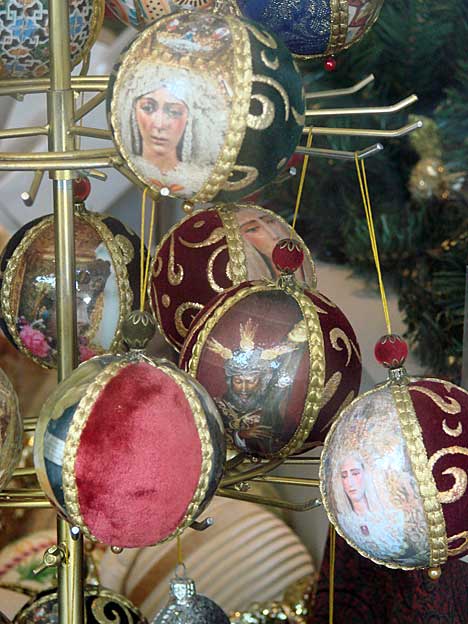 La foto superior corresponde a esta especie de feria de muestra de belenes a lo Plaza Mayor sin Chencho, montada entre dos edificios Patrimonio de la Humanidad, como la Catedral y el Archivo de Indias , con lo que aqui gusta una carpa, un chirriguito, un tenderente o una arquitectura efímera , pues en uno de sus escaparates donde están los dioramas de belenes y nacimientos nos encontramos con lo que ven en la foto superior . Un paso de la Borriquita, sus nazarenos, un cardernal, su capataz, sus costaleros , sus monaguillos y de propia lo contemplan una serie de monjas , acompañadas de Quijote y Sancho . ¿ Exactamente que coño ( sin perdón) tiene que ver todo esto con un portal de Belén ? .- Pero la cosa se complica tela, cuando no en estas muestra belenisticas, sino en una tienda en un lugar indeterminado de Sevilla ( no es cosa encima de hacer publicidad) uno se encuentra con una serie de bolas de arbol de Navidad , donde vemos a la Macarena, al Señor de la Salud de la Hdad de los Gitanos o la Virgen de las Mercedes de la Hdad de Santa Genoveva.- Otros colgantes navideños