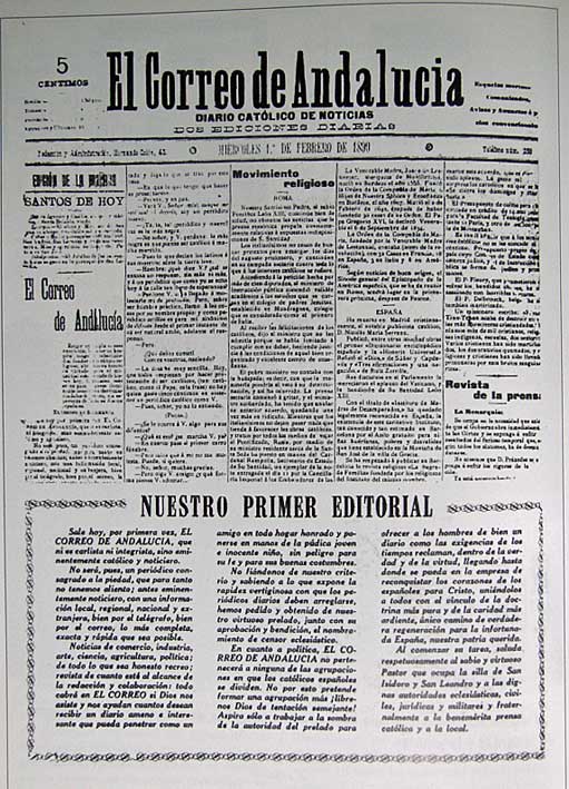 "Sale hoy por primera vez El Correo de Andalucía , que ni es carlistas, ni integrista , sino eminentemente católico y noticiero .- No será, pues un periódico consagrado a la piedad , que para tanto no tenemos aliento ;antes eminentemente noticiero , con una información, local, regional, nacional y extranjera , bien por el telégrafo, , bien por el correo, lo mas completo, exato y rápido que sea posible .- Noticias de comercio, industria, arte, ciencia, agricultura, política, de todo lo que sea honesto recreo, revista de cuanto este al alcance d ela redacción y colaboración; todo cabrá en EL CORREO , si Dios nos asiste y nos ayudan cuantos desean recibir un diario ameno e interesante que pueda penetrar como un amigo en un hogar honrado y ponerse en mano de la mas púdica joven e inocente niño, sin peligro para su fe ni sus buenas costumbres .- No fiándonos de nuestro criterio y sabiendo a lo que pone la rapidez vertiginosa con las que los periodicos diarios deben aplicarse hemos pedido y obtenido de nuestro virtuoso prelado , junto con su aprobación y bendición , el nombramiento de censor eclesiástico .- En cuanto a política EL CORREO DE ANDALUCÍA, no pertenecerá ninguna de las agrupaciones en que los católicos españoles se dividen. No por esto pretende formar una agrupación mas ! librenos Dios de tentaciones semejantes !. Aspira solo a trabajar a la sombra de la autoridad del prelado para ofrecer a los hombres de bien un diario como las exigencias que los tiempos reclaman dentro de la verdad y la virtud. llegando hasta donde se pueda en la empresa de reconquistar los corazones de los españoles para Cristo , uniédonlos a todos con el vínculo, de la doctrina mas pura y de la caridad mas ardiente , unico camino de verdadera regeneración para la infortunada España .- Al comenzar su tarea , saluda respetuosamente al sabio y virtuoso Pastor que ocupa la silla de San Isidoro y San Leandro y a las dignisimas autoridades eclesiásticas , civiles, jurídicas y militares y fraternalemnte a la benemérita presan católica y a la local " Un servido, no es periodista, no es un medio de comunicación ( algunas web les encanta jugar a esto, creando espejismos y hasta recondándolo y lo que es peor, autorecordándoselo constantamente ), pero sería muy triste para Sevilla ( Dios no lo quiera ) que llegara un día en que este rotativo desapareciera . Con todos los dineros que se roban, se tiran, se gasta en auténticas carajotadas inútiles, en esta triste ciudad, en esta triste región ( o comunidad de vecinos ) y no digamos nación ( es un decir, después del bochornoso espectáculo parlamentario al que asistimo ayer por televisión, uno llega sinceramente a pensar que todo esto funciona solo y no en mano de los inútiles a los que hemos votados ). Aquiencoñocorresponda , deberian de ayudar o rescatar ( frase dramáticamente de moda ), a algo mas que una empresa. al periódico decano de Sevilla .- Cada periódico que desaparece significa poner una venda mas en los ojos de la sociedad cada vez mas ciega, adocenada e idiotizada . Cada periodista que no puede hacer su trabajo es una voz menos que nos cuenta lo que los poderosos no quieren que sepamos y pretende ocultar, eso no ha perdido la mas mínima y diaria vigencia . Cada cabecera que echa el cierre limita nuestra libertad de información, de pensamiento y de expresión. - Aún creo que estamos a tiempo de salvarlo, con la ayuda de Dios .- |
