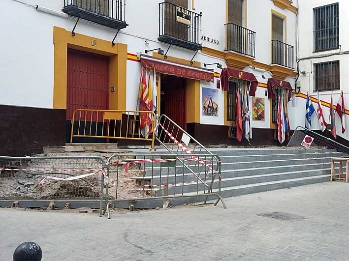 Pues oigan a qui en Sevilla tenemos la grada de Adriano pared con pared con el coso baratillero ( como diria un cursi ) , que estaba muy bien como estaba junto a esta tienda que pone de los nervios a los "twitter flauta" y a los "tontos de la banderita republicana", y que como puede apreciar la antigua grada de ladrillo taco a la tabla estaba perfectamente ( ver foto superior ) , estando en perfecta armonía y continuidad arquitectónica con la Plaza de Toros de Sevilla , tanto como la pintura en que esta enmarcada las puertas, como el color de estas .-