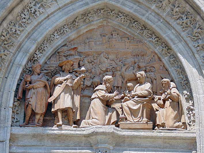 Pues gracias a estas fotos con muchisimos megas ( como ocurrió cuando le traje aqui hace tiempo los rostro de las vidrieras de la Catedral ), se descubren cosas que escapan a la vista humana, cosas que siempre es estimulante redescubrir y que tenemos delante. El Sr Galindo que vino de visita a nuestra ciudad al ver en su ordenador las fotos realizadas en su viaje reparó en un personaje de los "extras" en la escena de la Adoración de los Reyes Magos ....con gafas .-