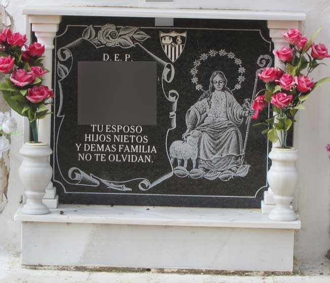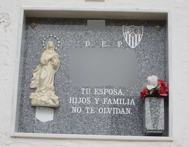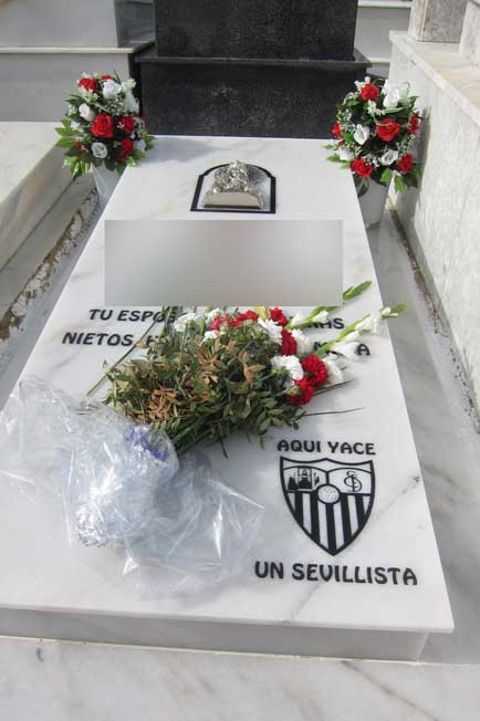 Lo podemos ver en esquelas como en la foto superior dedicada a un miembro de la histórica Peña Sevillista al Relente .- Aclaración las fotos que viene a continuación son absolutamente reales, están en el cementerio de san fernando de Sevilla y no son un montaje del adobo fotochó, donde lo único que se ha eliminado es la identificación de los finados .- Lápida donde aparece en solitario el escudo del Sevilla Esta lápida va mas allá y como pueden ver recalca en texto, en su parte inferior que : "AQUI YACE UN SEVILLISTA" Y por último como puede ver unos escudos sevillistas mas pequeños compartiendo sitio en la lápida con sus devociones religiosas |