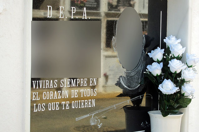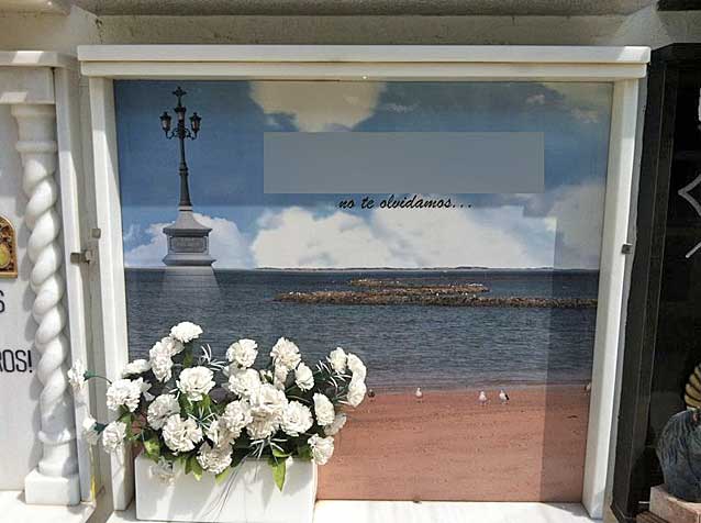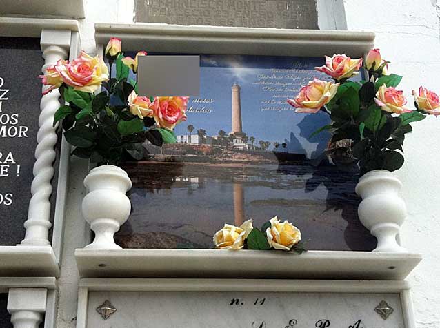 Y por aquello que estamos hablando de pesca , aqui le traigo estas dos lápidas a todo color, casi modelo postal; que no están en el cementerio de Sevilla, sino en el de una de las "playas sevillanas" , me refiero a Chipiona (confio que capten la broma ) . Ambas fotos me la remitió en su día un buen amigo, en una visita que hizo al camposanto chipionero y donde se pueden ver sus playas, el faro , gaviotas etc . Quien sabe, igual se ponen de moda aqui , con la Giralda, la Torre del Oro o las setas de la Encarnación .-