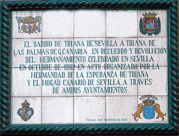 Este es el caso de la placa superior situada en unos laterales de la puerta de la Capilla de los Marineros con su hermananmiento con el barrio de Triana de la Palmas de Gran Canarias; azulejo que años después tuvo su homónimo en la calle Triana de la meritada isla canaria .-