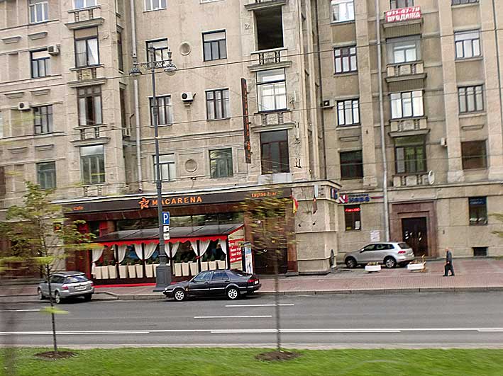 "Tal es el caso del nombre "Macarena" con el cual nos referencia la elección del mismo para el negocio que nos muestra de New York, (VER ) y con el mismo nombre que hace pocos día pude captar en un negocio de hostelería (intuyo que un restaurante), al paso desde el aeropuerto de San Petersburgo al centro de esta hermosa ciudad rusa. Efectivamente, el encontrar en el maremágnum del intrincado e incomprensible lenguaje cirílico,( ver anuncio superior en la ventana) algo tan rotundamente "nuestro", "comprensible y evocador como es el nombre "MACARENA"; no deja de causarnos una grata sensación mental de alegría, que se agradece, y nos recuerda que, por muy lejos que nos podamos encontrar de nuestra ciudad; siempre podremos encontrarnos "con nosotros mismos", al encontrarnos con las huellas que por el mundo van dejando esos "sevillanos de la diáspora" que, muy posiblemente, cada día, mantengan viva en sus sueños, la esperanza del regreso.-" |