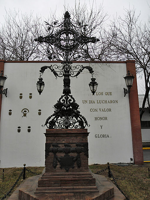Detalle del basamento con los ardonos de forja dentro del inconfundible emblema del arma de Artillería con una Cruz y dentro los nombres de los fallecidos .-