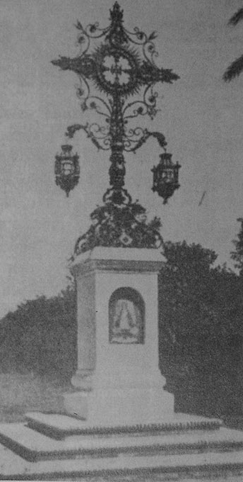 La Cruz de forja original en el Pabellón del Aceite de la Exposicion Iberoamericana de 1929 , con el basamento con un azulejo dela Virgen de los Reyes