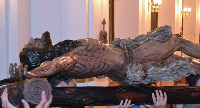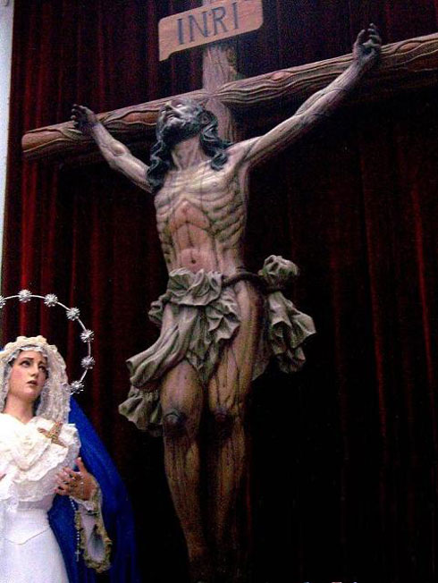 Se trata de la Real Cofradia del Santisimo Cristo de la Misericordia y Nuestra Señora del Mayor Dolor con sede en la Parroquia de Jesús Nazareno . El Crucificado se talló en 1975 y es de Francisco Palos Chaparro, y policromado por Francisco Buiza .- Asi mismo Maria Stma. del Mayor Dolor al igual que el Misterio ( San Juan , Maria Magdalena y un centurión romano tambien es obra de Francisco Palos Chaparro , procesionando el Viernes Santo .- Les traigo diferentes angulos, pues como pueden ver el parecido es mas que notable con el Cachorro de Triana .Juzguen por ustedes mismos .-