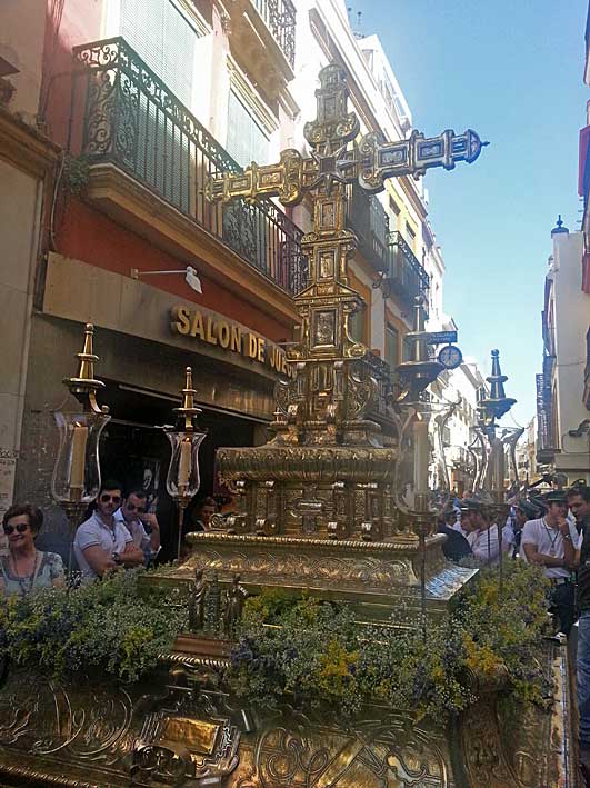 Queridos lectores, desagradables y leales lectores de estas lineas, no se si recordaran , cuando ya hace tiempo les traje aqui , La Cruz de Mayo mas antigua ; pues miren ustedes por donde años mas tarde no la volvemos a encontrara por plena calle Sierpes y donde según nos informa su autor-propietario, es cedida desde hace algún tiempo a la Hermandad del Rocio del Salvador o Sevilla ( o como la quieran llamar ) , para que salgan con ella la sección INFANTIL de sus hermanos .-