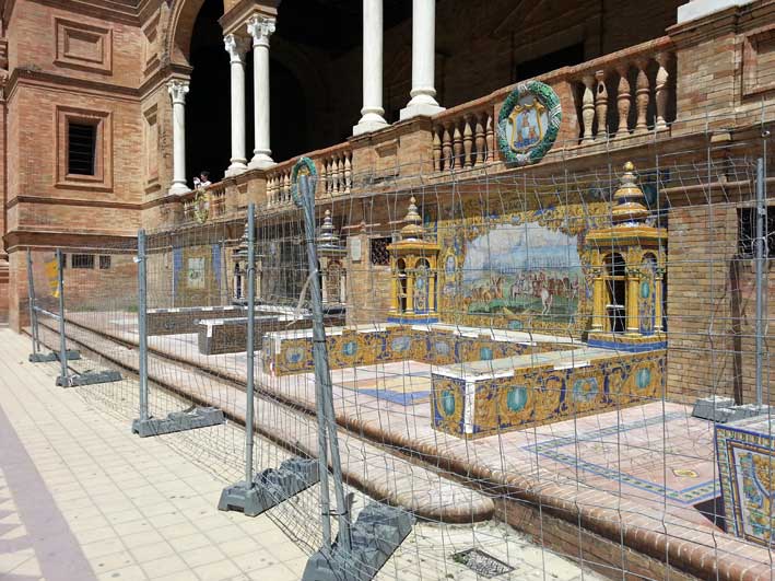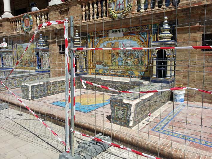 No se puede estar constantamente vallando, parcheando, reparando, las huellas del gamberrismo que lo tienen terriblemente fácil para dañar. Esto es un espacio absolutamente gratuito de Sevilla a todos los que lo visitan, un regalo, un lujo y ha cambio este es el pago que recibe, por lo que deberian de plantearse seriamente tanto su protección, como una mas que justa recaudación , como por otros monumentos sevillanos , para que resulte sostenible ( palabra muy en boga ) y esté como debe de estar, en perfecto estado de revista .; es decir convertila en una Parque Temática Plaza de España .-