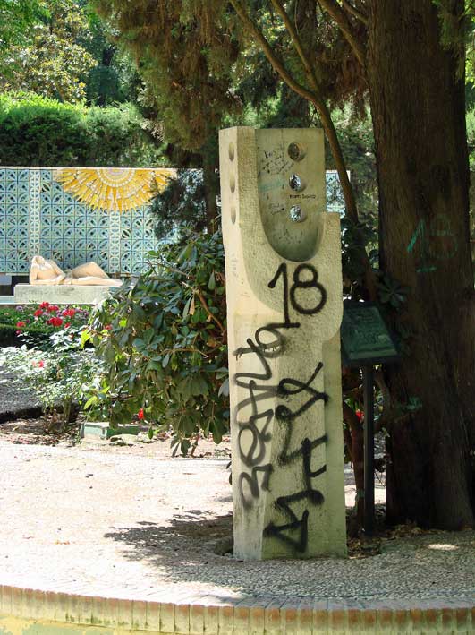 Aqui pueden VER , como era esta glorieta cuando estaba bien . A principios de Julio de 2013 unos gamberros la atacaron VER y un año después sigue estando exactamente igual , y de propina unos grafiteros han dejado tambien su huella en el absurdo monolito que hay en la mencionda glorieta .- Estamos de acuerdo que un acto de irracional gamberrismo es impredecible , pero si lo sumanos a la desidia nos da como resultado el mas doloroso de los abandonos, cuando por otro lado se esta celebrando y anunciando un centenario por todas partes . Extraña y contradictorias conclusiónes pueden sacar nuestros visitantes, cuando vean cosas como estas, desambulando por el parque, con su sombrerito de paja, botellita de agua y plano en la mano, mas despitados que una cabra en un garaje .- Tras todo un año de espera , yo invocaría el espiritu de aquel Zoido de chubasquero y pala limpiando el Vacie, o colocando bancos de mobiliario urbano en Bellavista, para que aprestara a dar las ordenes oportunas , para reparar y limpiar este destrozo que cumple aniversario, que es el mejor regalo de cumpleaños que se le puede hacer a nuestro universal parque .-
