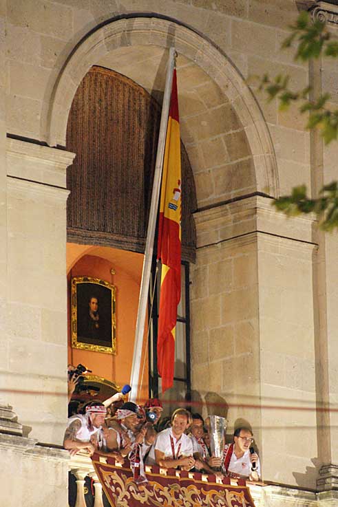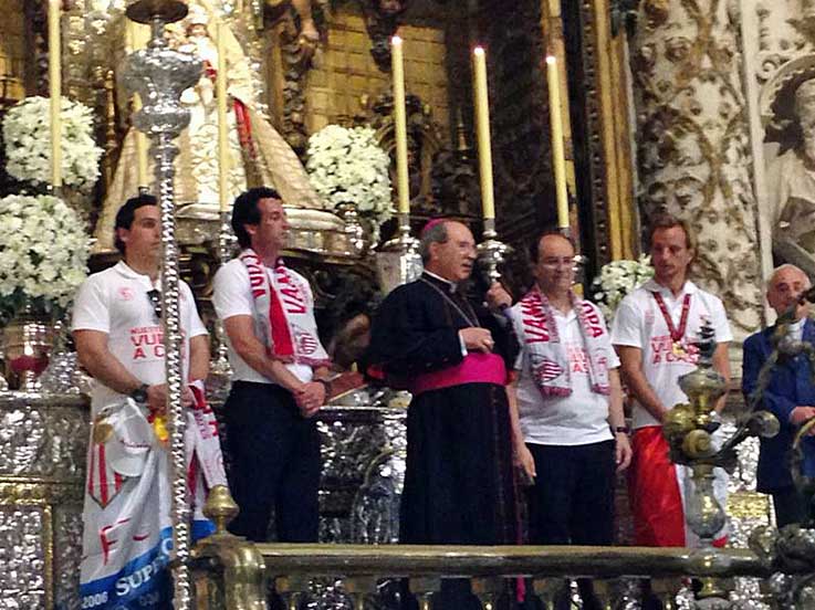 Jugadores y directiva del Sevilla FC junto a nuestro arzobispo monseñor Asenjo, ante la Patrona de Sevilla la Virgen de los Reyes Espectacular aspecto de la Plaza Nueva literalmente tomada por el sevillismo Los jugadores y el presidente del Sevilla FC en los balcones del ayuntamiento de Sevilla con la copa de la UEFA Europa League |