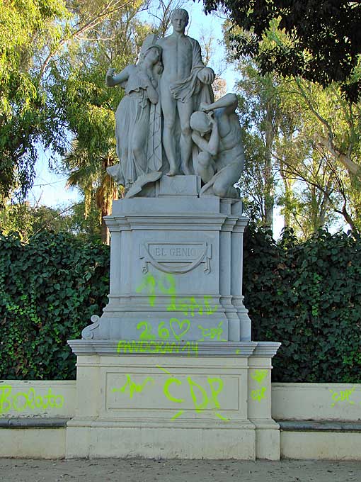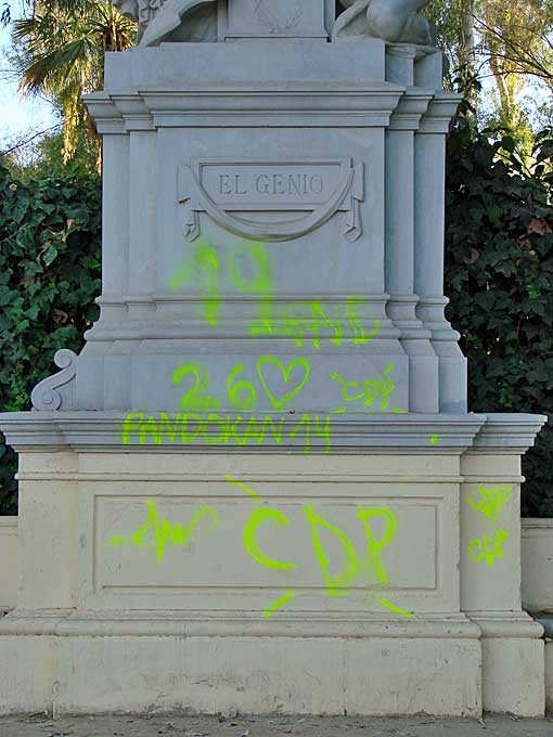 Esta misma semana el alcalde de Sevilla , visitaba oficialmente esta restauración que ha costado la broma de 62.500 euros .Irónia del destino comenzaba sus palabras diciendo : "Vean, comparen y saquen sus propias conclusiones" .Después pasó a escadalizarse de como estaba un arbolito maltratado proximo ( sin darse cuenta que estaba todos iguales) y publicarón un inoportuno twuitt , despues de haber arrasado de arboles Almirante Lobo .- Ayer uno de los grupos escultóricos alegóricos amanecía llena de gamberros en incultos graffitis ( en todo esto no hay absolutamente nada de cultura urbana solo salvajismo ), de amarillo fosforescente, como si quisieran subrayar el "horror vacui" ( miedo al vacio ) a lo limpio, a lo resturado o a lo bien conservado .- Como diría Juaninacio ; "Vean, comparen y saquen sus propias conclusiones", exactamente esto es lo que dura una restauración en Sevilla .- Frente a esta absurdas e