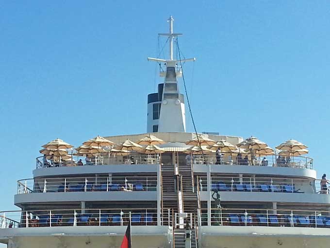 El MS Deutschland sale de unos astilleros germanos en Bremenhafen en 1998. En el se rodó la versión alemana de Vacaciones en el Mar ( esta vez sin coña sino de verdad ) .El MS Deutschland tiene siete cubiertas para pasajeros, y acoge a 500 huéspedes. Sus camarotes, que van desde las suites de 30 m2, pasan por las Classic de 15 m2 a la clase Kabinett de 15 a 12 m2 .-