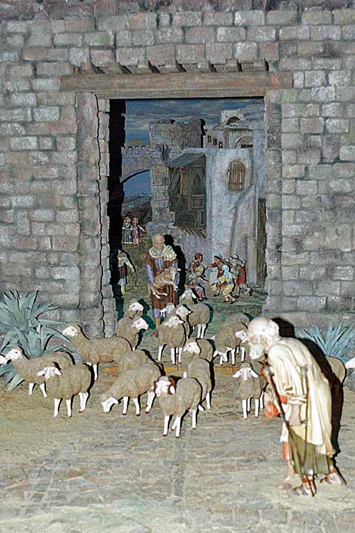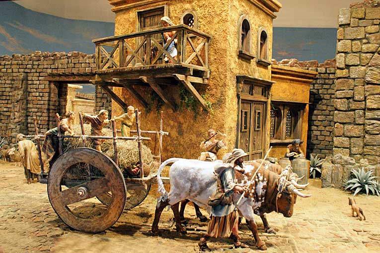 Una curiosdad del Belén de este año es que no tiene portal. El Misterio con San José , la Virgen y el Niños Dios en sus brazos , están en una escena exterior delante de un carro , donde tampoco aparecen la mula y el buey .- |