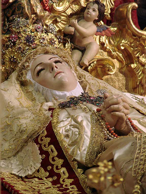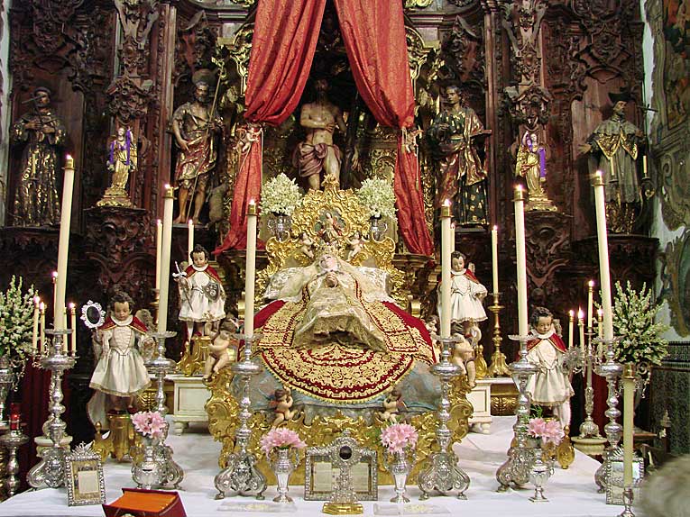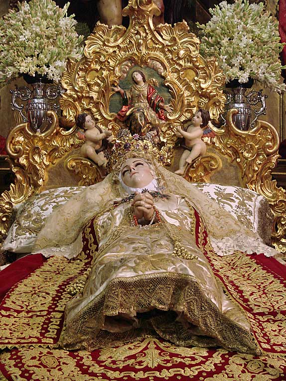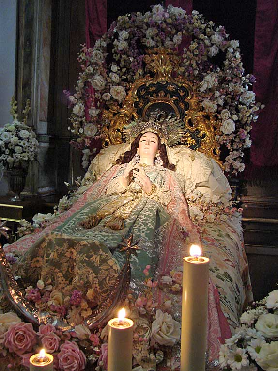 Luego nuestro pasos nos llevarian a la calle Cardenal Spinola , al convento de Santa Rosalia de las monjas clarisas , en cuya iglesia en un entorno único por su colección de retablos, donde se celebraba el Besamanos de la bella imagen de la Dormición de la Virgen , con un exhorno muy personal con profusión de abundantes flores .-