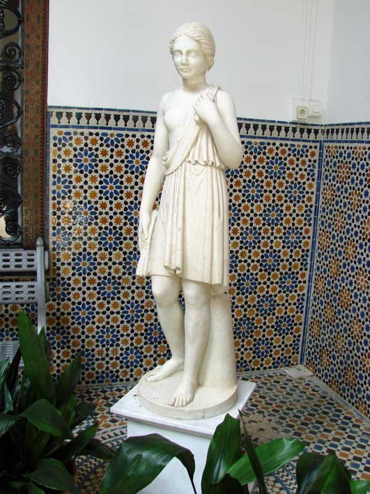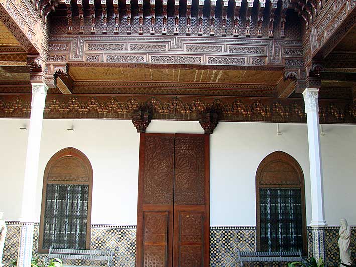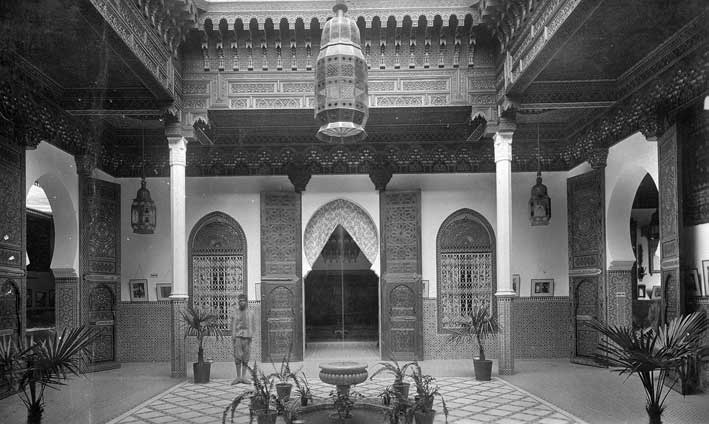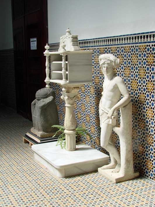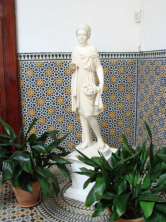 y los suelos, con mosaicos. En el centro con una fuente de mármol