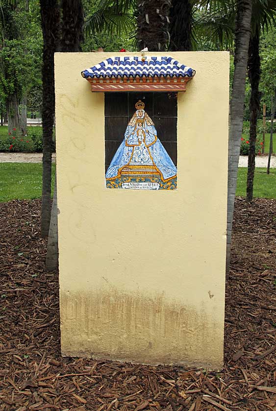 Durante dicha Feria se realizó la instalación de una fuente, bancos cubiertos con azulejos sevillanos y un muro con hornacina, también recubierto de azulejos que permitió la instalación de una Virgen de los Reyes, todo ello fue transformado en el año 1995, que se lleva a cabo la rehabilitación de este sector .- Como pueden ver en la foto superior se colocó una fuente en el centro de la glorieta, incorporándose en su base un zócalo con los nombres, que antes figuraban en el murete con azulejos, de personajes literarios sevillanos como pueden leer Luca de Tena o Luis Montoto . Se sustituyeron los bancos con azulejos muy deteriorados por otros de madera y como pueden ver se mantuvo el azulejo dedicado a la Virgen de los Reyes ( Foto inferior ) .-