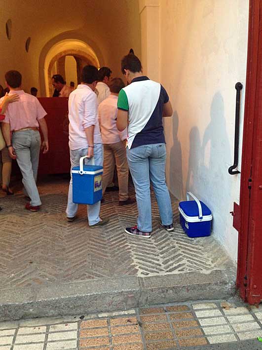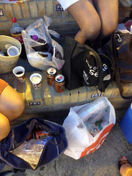 La plaza de toros de Sevilla, la Maestranza , era un referente de saber ir y saber estar en los toros. Señoras, señoritas y caballeros, se arreglan para ir a las corridas de la Feria de Abril ( o Mayo de Zoido ) . El respetable va con chaqueta y corbatas ellos, o vestido primaveral ellas . Pasando por los silencios maestrante, que van desde respeto a un diestro que esta delante de un toro o los silencios como simbolo de mayor castigo de indiferencia ante una desafortunada actuación . Hasta ahí todo esta bien .- El problema es que cuando llega el verano desde hace ya bastante tiempo, en esos ciclos de novilladas nocturnas de los jueves, ese mismo sitio y ese mismo público se transforma, no solo por la indumentaria, chanclas, pantalones piratas o cortos y camisetas ( indumentaria mas propia de las costas playeras, con la justificación de los calores), sino en su comportamiento lamentablemente cambia como pueden ver en estas fotos que les adjunto .-