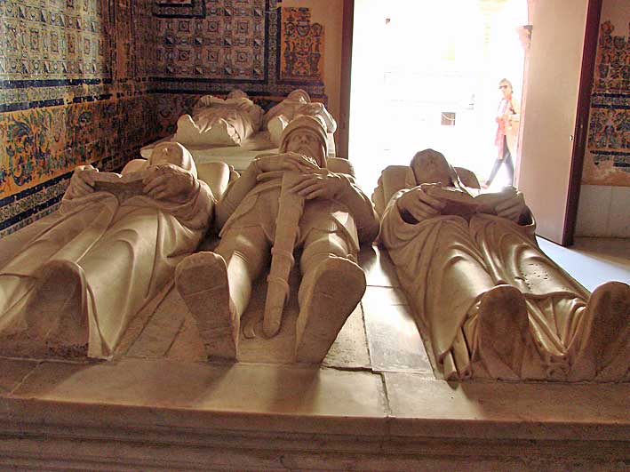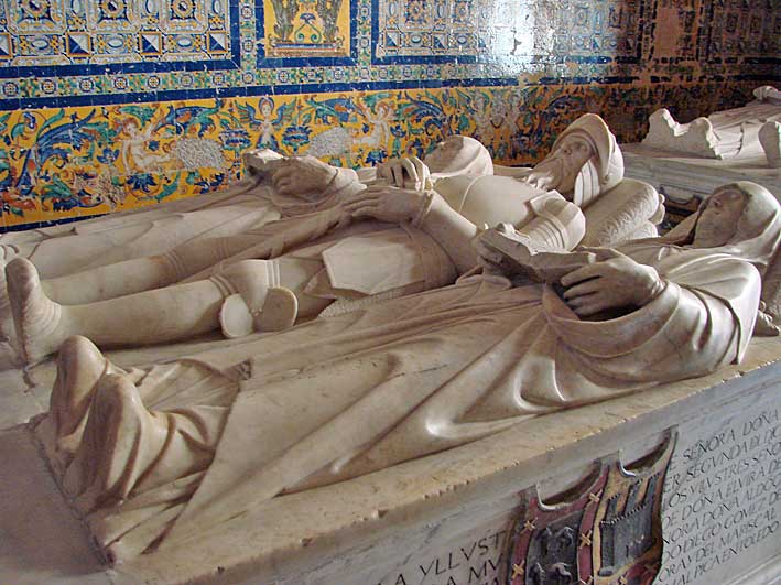 Estas seis tumbas matrimoniales, cuatro de ellas en el sentido literal de la palabras, y dos de estas hasta con segunda nupcias , estuvieron en el monasterio hasta 1838 que con la Desamortización de Mendizabal se trasladaron a la Iglesia de la Anunciación . Para ser mas exactos, de las tumbas de la 1 a la 4 estuvieron primero en el templo, y a partir de los años sesenta del siglo XX pasaron al pateon de los Sevillanos Iluestres, mientras que la 5 y 5B estuvieron dentro de la propia Iglesia adosadas a las paredes a modo de retablos sepulcral ) y alli permanecieron hasta finales de 1991 que con motivo de los fastos de la Exposición Universal del 1992 regresaron a su lugar de origen ( al monasterio me refiero , no donde estaba realmente, que era en la Iglesia del mismo ) .-